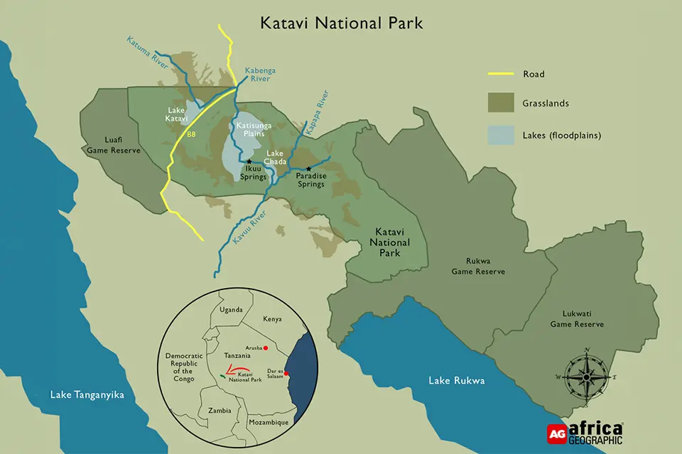 At 4,500km2 (450,000 hectares), Katavi is one of Tanzania’s largest national parks. It is situated not far from the country’s western border, just east of Lake Tanganyika in a truncated arm of the Great Rift Valley that ends around Lake Rukwa.